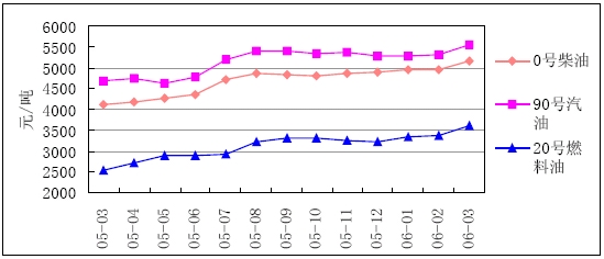2006年,受各種因素作用的影響,國際油價持續在高位波動,3月份,布倫特原油(普氏現貨,下同)價格為61.2 美元/桶,同比上漲15.4%。成品油價格繼續上漲,95#無鉛汽油為68.9 美元/桶,同比上漲15.9%;柴油77.6 美元/桶,同比上漲16.1%。為緩解國內成品油與原油價格倒掛的矛盾,3 月26 日,發展改革委再次提高成品油出廠價格,汽油、柴油價格分別提高300 元和200 元,調整后出廠價格分別為4700 元/噸和4070 元/噸,隨后,各地成品油價格紛紛上揚。3 月末,國內市場0 號柴油價格平均為5179 元/噸,比2 月提高4.26%;國內市場90 號汽油價格平均為5567 元/噸,比2 月份提高4.5%;20 號燃料油價格為3615 元/噸,比2 月份提高6.76%。國家調高成品油價格效應顯現。