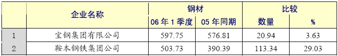 2006年1季度全國十大鋼鐵企業鋼材生產情況