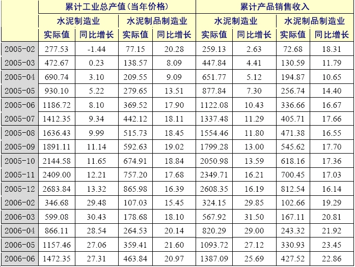 2006年1-6月,水泥制造業(yè)累計(jì)工業(yè)總產(chǎn)值1472.35億元,同比增長(zhǎng)27.31%,增幅比上年同期上升了19.21個(gè)百分點(diǎn);實(shí)現(xiàn)產(chǎn)品銷(xiāo)售收入1387.09億元,同比增長(zhǎng)25.69%,增幅比上年同期上升了15.26個(gè)百分點(diǎn)。 水泥制品制造業(yè)的產(chǎn)銷(xiāo)情況不如水泥制造業(yè),1-6月其工業(yè)總產(chǎn)值增速比水泥制造業(yè)低6.34個(gè)百分點(diǎn),產(chǎn)品銷(xiāo)售收入增速比水泥制造業(yè)低2.83個(gè)百分點(diǎn)。雖然水泥制品制造業(yè)的產(chǎn)銷(xiāo)增長(zhǎng)情況不如整個(gè)水泥制造業(yè),但是其產(chǎn)銷(xiāo)增幅還是好于去年同期。