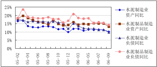 2005 年以來,水泥制造業資產和負債增速放慢,水泥制品制造業情況大致相同。2006 年3 季度末,二者資產負債率與上季度末相比,變化不大。