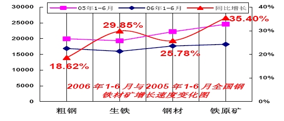 2006年年二季度,全國產鋼10728萬噸,同比增長23.21%,同比增加粗鋼產量2021萬噸;生產生鐵10325萬噸,同比增長25.27%,同比增加生鐵產量2083萬噸;生產鋼材11993萬噸,同比增長32.39%,同比增加鋼材產量2934萬噸;生產鐵原礦14262萬噸,同比增長40.25%,同比增加產量4093萬噸。二季度,全國出口鋼材1063萬噸,同比增長41.36%;進口鋼材480萬噸,比去年同期下降24.76%。