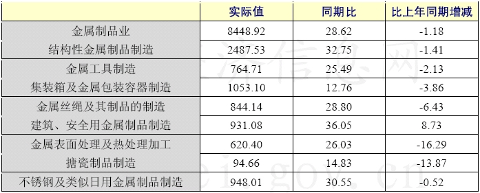 2006年,截止四季度末,金屬制品業共完成工業總產值8448.9億元,同比增長28.62%,增速比上年同期下降了1.18個百分點。