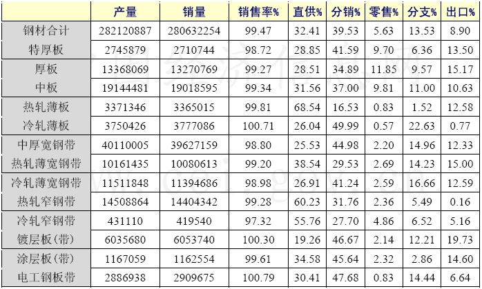 2006年,重點統計單位共銷售鋼材28063.22萬噸,鋼材產銷率為99.47%,按品種實物產銷率分別為:特厚板98.72%、厚板99.27%、中板99.34%、熱軋薄板99.81%、冷軋薄板100.71%、中厚寬鋼帶98.80%、熱軋薄寬帶99.20%、冷軋薄寬鋼帶98.98%、熱軋窄鋼帶99.28%、冷軋窄鋼帶97.32%、鍍層板(帶)100.30%、涂層板帶99.61%、電工鋼板帶100.79%。