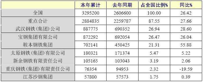 2006年,全國(guó)電工鋼板帶產(chǎn)量329.52萬(wàn)噸,同比增長(zhǎng)26.42%,重點(diǎn)統(tǒng)計(jì)單位產(chǎn)量288.48萬(wàn)噸,占全國(guó)產(chǎn)量的87.55%。其中武鋼88.78萬(wàn)噸,增長(zhǎng)28.60%,占全國(guó)產(chǎn)量的26.94%,寶鋼87.23萬(wàn)噸,同比增長(zhǎng)28.60%,占全國(guó)26.47%,鞍本集團(tuán)70.21萬(wàn)噸,增長(zhǎng)55.88%,占全國(guó)產(chǎn)量21.31%。前三家企業(yè)產(chǎn)量占全國(guó)產(chǎn)量的74.72%。