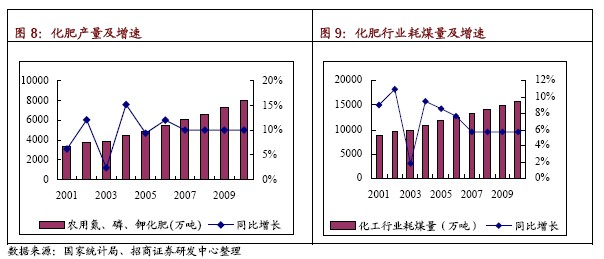 預計07 年、08 年化肥產量分別為6022 萬噸和6624.4 萬噸,同比分別增長10%和10%。考慮到每年4%的節能降耗,預計07 年、08 年的化肥行業煤炭消耗量為12634 萬噸和13362 萬噸,同比增長5.77%和5.77%。