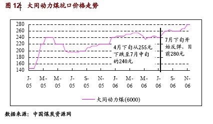 從7 月底開始,大同動力煤坑口價(不含稅)受需求拉動上漲至8 月底的265 元/噸,9 月份回調到260 元,10 月份上漲7 元/噸,11 月煤炭價格上漲13 元/噸至目前為280 元/噸,不斷創出年內新高。