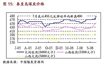中轉地秦皇島煤炭價格從年初的460 元/噸上漲到4 月份的最高價格470 元/噸,之后小幅回落,06年7 月底從455 元/噸開始反彈,06年8 月份上漲了15 元至470 元/噸,回到年內高點。06年10 月份又小幅上漲2 元,11 月份大幅上漲15 元至490 元/噸,續創年內新高。
