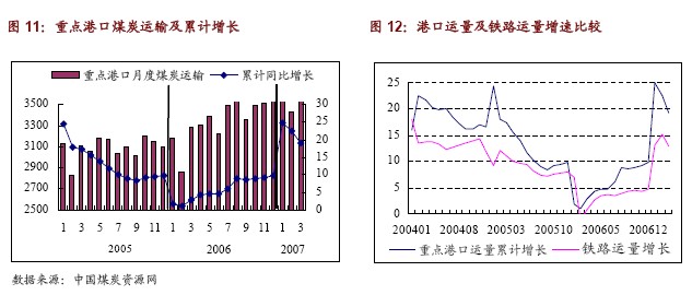 07年3 月份,重點(diǎn)港口煤炭運(yùn)輸3725.1 萬噸,同比增長15.19%,前三月累計(jì)運(yùn)量11107.9萬噸,同比增長19.16%,較06 的9.88%大幅提升。