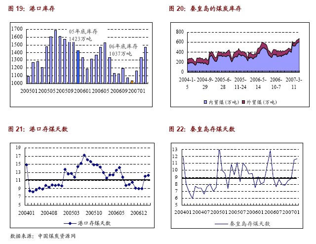 07年3 月份的港口庫存1473.9 萬噸,較06 年底的1037.4 萬噸上升了436.5 萬噸(或42.08%)。截止到4 月22 日,秦皇島的煤炭庫存為672.1 萬噸,較06 年底的440.6 萬噸增長了52.54%。與06 年6 月份的高位庫存相當(當時的高庫存直接導致了煤炭價格的走低)。
