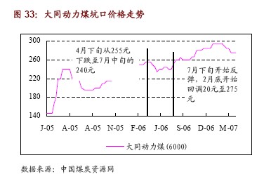 ?? 07年4 月30,大同動力煤坑口價(不含稅)為275 元/噸,較1 月份的高點(diǎn)295 元/噸下降了20 元/噸。目前價格較06 年7 月份的低點(diǎn)240 元/噸上漲了35 元/噸,漲幅達(dá)到14.58%,基本穩(wěn)定。