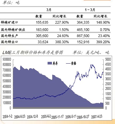 1~3月份我國凈出口精鋅15.29萬噸,同比增長399.20%。2006年11月鋅現貨升水保持在100美元左右,進入2007年后,現貨升水開始下降,目前,鋅現貨僅升水15-21美元/噸。