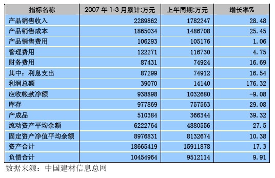 根據中國建材信息總網統計:2007年1-3月份匯總水泥上報企業141戶,匯總產品銷售收入為2289862萬元,比上年同期增長28.48%;利潤總額為39070萬元,與去年同比增長176.32%;工業總產值(現價)完成2151334萬元,比上年同期增長了19.67%;工業銷售產值(現價)完成2002895萬元,比上年同期增長了19.24%。具體見下表2: