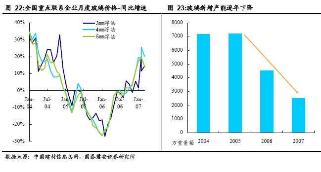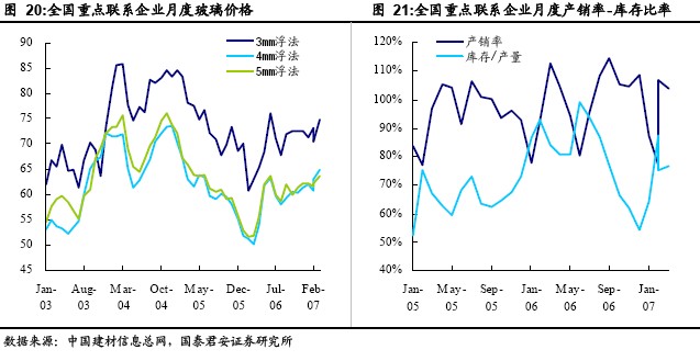 類似于水泥,2007年4 月份玻璃價格環比回升,其中3mm、4mm、5mm 價格分別同比回升6.1%、3.1%、2.4%。從季節性需求差異的角度理解,玻璃和水泥一樣每年第一季度因建筑施工減少、春節長假和設備檢修等因素,玻璃需求相對較小,進入4月份后,隨著天氣轉暖建筑施工引致玻璃需求增加,玻璃價格開始季度性的復蘇。 4 月份玻璃產銷率仍維持在104%的高水平,庫存率77%尚處適當水平。