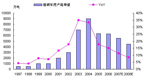統(tǒng)計(jì)顯示,2006年以來煉鐵、煉鋼產(chǎn)能增速均下降至15%以下,近幾年煉鐵煉鋼大規(guī)模投資接近尾聲,粗鋼產(chǎn)量增速將放緩 。且 2007年以來國家沒有批準(zhǔn)任何新建項(xiàng)目,寶鋼、武鋼等項(xiàng)目需等淘汰取得實(shí)質(zhì)效果后才放行 。