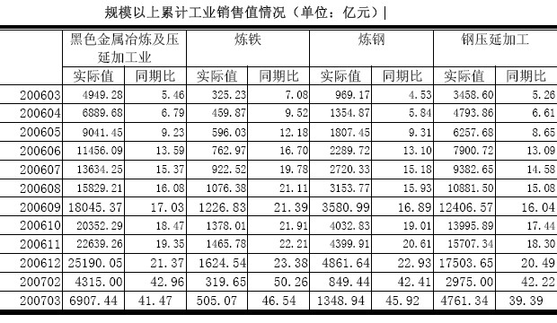 07年一季度,我國主要用鋼行業生產增長幅度都在20%以上,鋼材消費需求保持較高水平。且由于消費繼續旺盛,港忒行業總體銷售狀況繼續好轉。07年一季度累計,鋼鐵行業共完成工業銷售值6907.44億元,同比增長41.47%,增速比上年同期提高34.7各百分點。