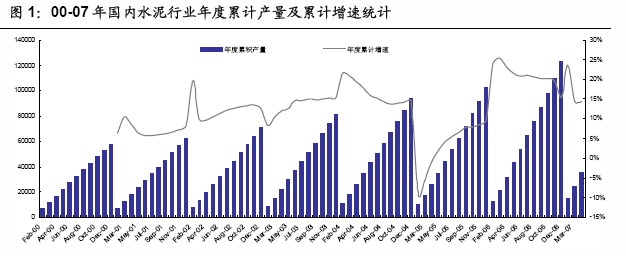 2007年1-4月,國內(nèi)水泥累計(jì)產(chǎn)量為3.59億噸,同比增長為14.4%,增幅同比下降7.4個百分點(diǎn),較06年全年增速下降1.1個百分點(diǎn)。??目前的水泥產(chǎn)量增速仍處于2000年以來的較高水平,預(yù)期07年國內(nèi)水泥產(chǎn)量增速約12-13%,盡管數(shù)值略低于06年,但仍屬于高增長的水平。