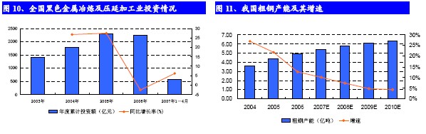 2007年1-5月投資增速4.6%。而且目前的鋼鐵行業投資主要集中于下游的軋鋼領域,用于粗鋼產能的投資增長有限。結合國家鋼鐵行業產能淘汰政策,預計未來幾年我國鋼鐵業產能增長將進入平穩期,粗鋼產量增速預計在5~10%之間,生鐵產量增速預計在8~14%之間。