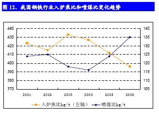 盡管自2003年以來,我國鋼鐵行業的入爐焦比開始降低,而2004年以來噴煤比開始上升,但與國外發達國家相比,仍然存在一定的差距。