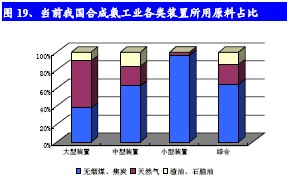 目前,合成氨行業中以無煙煤或焦炭為原料的企業約為65%,以天然氣為原料的約占22%,其余部分主要以重油或石腦油為原料。