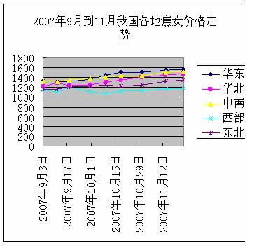 1.焦炭價格不斷上漲 在07年9月份,焦炭市場行情步入大幅上漲的局面,部分焦化企業已經調整30至50元/噸左右,隨后華東及河北部分地區上漲30至40元/噸,東北地區也在觀望后也上調50元/噸左右。另外,華北地區的焦化企業經過艱苦談判,“八五”之爭在鋼廠用戶接受80元/噸漲幅的協議下結束。至此,焦炭市場新的一輪價格上漲基本完成,市場逐漸進入盤整局面。10月到11月中旬,全國的焦炭價格保持了比較穩定的增長態勢(參見下圖)。基于煤炭分布的不平衡,各地的市場價格每噸也相差十幾元到上百元不等,尤其是焦炭需求比較旺盛的華東地區和煤炭資源豐富的地區基本保持了每噸上百元的差距。