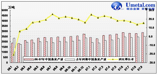 在2007年9月份,全國焦炭產量為2890.25萬噸,,較8月份的2,795.84萬噸增加了4.16萬噸,10月全國焦炭產量為2854.28萬噸,相比9月份有少量的減少。1至8月全國累計生產焦炭 21,298.83萬噸,較06年同期相比增長20.1%。雖然焦炭產量依舊保持快速增長,但增幅保持穩步回落態勢,主要是因為目前在國家政策及煤炭市場資源緊價格高的情況下,焦炭的產能釋放受阻,產量有所降低。