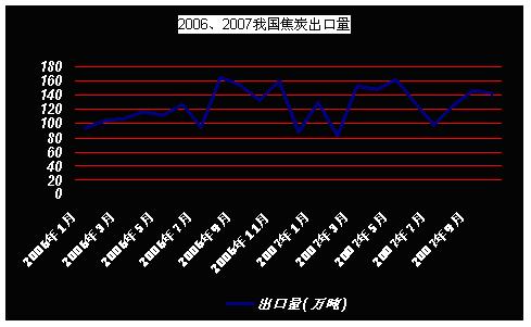 在煤炭出口方面自2006年以來,我國焦炭雖然有一定的波動,但在相對穩定,在經歷了2007年7月份的出口低峰后,8月份焦炭出口量再次增加。據海關數據顯示,2007年8月份國內出口焦炭124萬噸,較7月增加26.31萬噸,環比增加 27%;較06年8月份減少40.42萬噸,同比減少25%。2007年1至8月,累計出口焦炭1,027萬噸,同比增加12.1%,累計金額 181,682.6萬美元,同比增加49.2%。9月份和10月份基本保持了8月份的增長勢頭,出口焦炭分別為142萬噸、140萬噸。