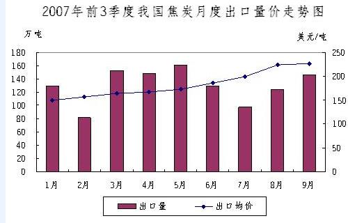 據(jù)海關(guān)統(tǒng)計,今年前3季度我國累計出口焦炭1173.1萬噸,價值21.5億美元,比去年同期分別增長9.6%和48%;出口平均價格為183.2美元/噸,同比上漲35%。其中,6、7月份分別出口焦炭130.3萬噸和97.7萬噸,環(huán)比分別下降19.1%和25%,出口均價均在200美元/噸以下。8月份以后焦炭出口均價迅速攀升,8月份上漲至223.9美元/噸,9月份達226.7美元/噸;與此同時,焦炭月度出口量開始重新放大,8、9月份出口量分別達124.4萬噸和146.8萬噸,環(huán)比分別增長27.3%和18%(下圖)。