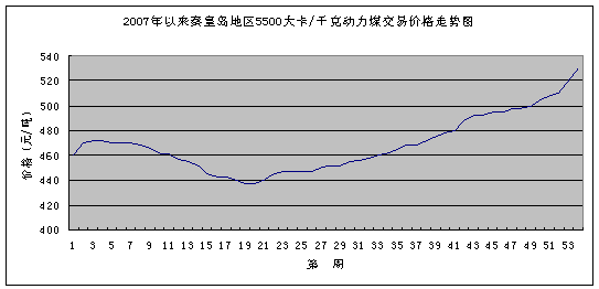 2007年底,秦皇島地區市場動力煤交易價格曾經出現了一輪加速上漲過程,在三、四天的時間內,具有代表性的發熱量5500大卡/千克動力煤的平倉價格上漲了10元/噸,達到510-520元/噸。