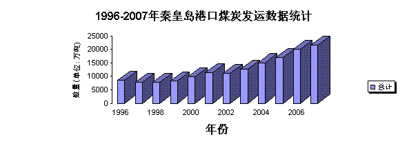 1996-2007年十一年間秦皇島煤炭的發(fā)運(yùn)量總體呈上升態(tài)勢(shì),震蕩上行。1998年發(fā)運(yùn)量為7792萬(wàn)噸,是十年內(nèi)發(fā)運(yùn)量最低值;2007年港口發(fā)運(yùn)量21500萬(wàn)噸,是十一年內(nèi)發(fā)運(yùn)量最高值。十年間整體分為三個(gè)階段,1996-1998,2002年呈負(fù)增長(zhǎng)態(tài)勢(shì);1999-2001,2003-2007呈正增長(zhǎng)態(tài)勢(shì)。