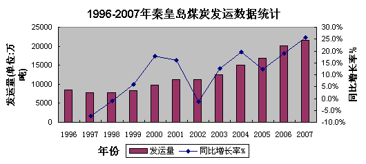 根據(jù)煤炭網(wǎng)產(chǎn)業(yè)研究中心統(tǒng)計(jì)1996-2007年十一年間秦皇島港口煤炭發(fā)運(yùn)量以及增長(zhǎng)率統(tǒng)計(jì):
