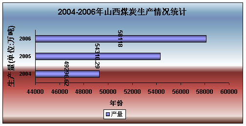 2006年山西省國有重點煤炭企業原煤產量30063萬噸,同比增加3473萬噸,增幅為13.06%;地方國有煤礦完成原煤生產9630萬噸,同比增加1003萬噸,增幅為11.63%;鄉鎮煤礦生產18425萬噸,同比減少669萬噸,減幅為3.5%。