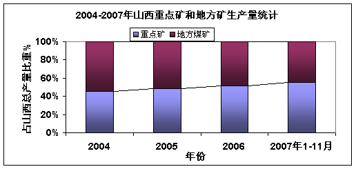 近幾年由于國家政策調整,對中小煤礦進行大力整頓,部分小礦關停。從圖表看出,通過整頓,國有重點礦的生產總量在山西省煤炭生產總量的比重逐步增加,由圖表看出,由2004年的45.1%增長到2006年的51.7%,增幅6.6%。而地方煤礦的生產總量雖然有小幅上升趨勢,但總體平均增速1.9%明顯低于國有煤礦17.6%的平均增速,導致重點煤礦的生產總量比重逐年上升。