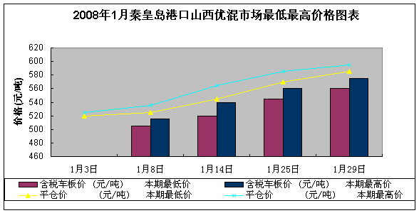 2008年1月份秦皇島港口山西優混煤價格(熱量值(5500大卡/千克)含稅,平倉價)整體呈一路上升態勢。