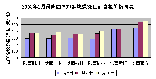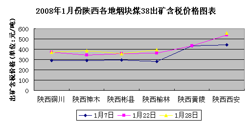 2008年1月份陜西各地?zé)熋簤K38出礦含稅價(jià)格整體呈上揚(yáng)趨勢(shì)