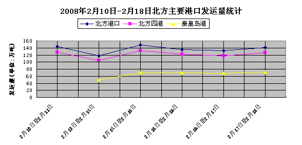 2008年2月10日至2月18日北方各主要港口煤炭發(fā)運(yùn)量整體呈下行趨勢。北方港口和北方四港發(fā)運(yùn)量走勢呈先抑后揚(yáng)態(tài)勢,而秦皇島港口煤炭發(fā)運(yùn)量表現(xiàn)為一路下行。