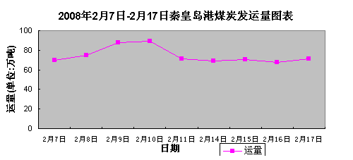 2008年2月7日-2月17日秦皇島港口煤炭發(fā)運(yùn)量整體走勢表現(xiàn)平穩(wěn),呈先揚(yáng)后抑態(tài)勢。港口發(fā)運(yùn)量由2月7日的70萬噸攀升至2月17日的71.5萬噸,增幅1.5萬噸,波幅甚小。2月7日至2月10日秦皇島煤炭港口發(fā)運(yùn)量呈快速上揚(yáng)態(tài)勢,由2月7日的70萬噸上行至2月10日的89萬噸,增幅19萬噸。2月10日至2月17日秦皇島港口煤炭發(fā)運(yùn)量整體呈下行趨勢,由2月10日的89萬噸下行至2月17日的71.5萬噸,減幅17.5萬噸。