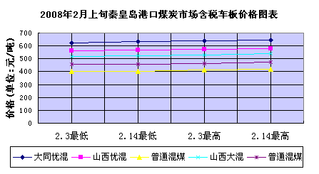 大同優(yōu)混煤車板含稅價格相對高位,價格位居秦皇島港口各煤炭品種價格首位。2008年2月上旬大同優(yōu)混煤車板含稅價格整體呈現(xiàn)上揚(yáng)趨勢,含稅車板最低價格由2月3日的625元/噸攀升至2月14日635元/噸,攀幅10元/噸。含稅車板最高價格由2月3日的640元/噸攀升至2月14日645元/噸,攀幅5元/噸。