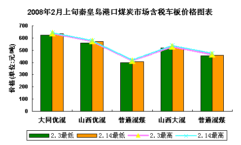 普通混煤價格相對低位。2008年2月上旬普通混煤車板含稅價格整體呈現(xiàn)上揚(yáng)趨勢,含稅車板最低價格由2月3日的455元/噸攀升至2月14日460元/噸,攀幅5元/噸。含稅車板最高價格由2月3日的465元/噸攀升至2月14日475元/噸,攀幅10元/噸。