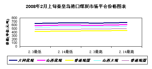 大同優(yōu)混煤平倉價格相對高位,價格位居秦皇島港口各煤炭品種平倉價格首位。2008年2月上旬大同優(yōu)混煤平倉價格整體呈現(xiàn)上揚趨勢,平倉最低價格由2月3日的645元/噸攀升至2月14日660元/噸,攀幅15元/噸。平倉最高價格由2月3日的655元/噸攀升至2月14日670元/噸,攀幅15元/噸。