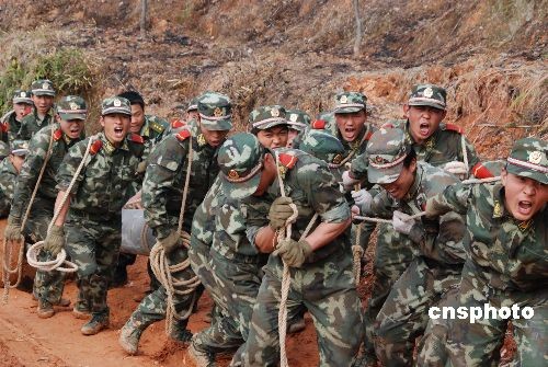 在福建西北部冰雪災區,福建省武警總隊二千多名官兵繼續日夜奮戰在抗冰災第一線,全力以赴地搶修電力線路,力爭在二月底前恢復各鄉村電力暢通。中新社發曾朝群攝