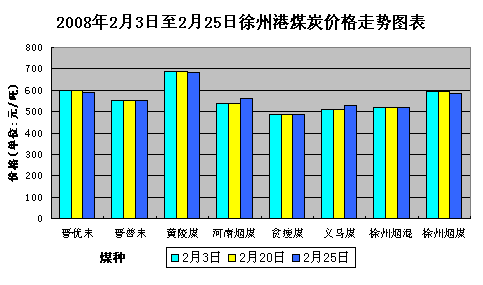 2008年2月3日至2月25日徐州港煤炭價格上半月走勢基本平穩,下半月漲跌互現。