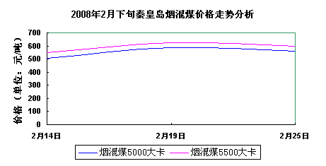 2008年2月下旬秦皇島煙混煤5000大卡和5500大卡價(jià)格走勢呈上揚(yáng)態(tài)勢,秦皇島煙混煤5000大卡由505元/噸攀升至560元/噸,波幅55元/噸左右。秦皇島煙混煤5500大卡由550元/噸攀升至600元/噸,波幅50元/噸左右。