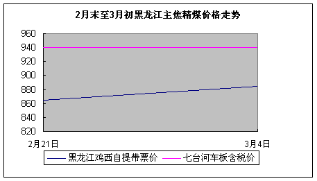 2月末,黑龍江地區(qū)隨著煤礦的陸續(xù)開(kāi)工,資源供應(yīng)緊張緩解,價(jià)格近期較穩(wěn)定;3月初,由于煉焦煤的需求加大,煉焦煤有輕微上漲,幅度在10-20元水平。