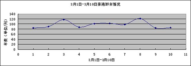 3月1日- 3月10日這段時間內,接卸最多的一天為122列,最少的一天為84列。其中 3月 8日接卸車數最多為122列; 3月1日、9日接卸車數最少為84列; 3 月2日、4日接卸車數在90列左右;3月3日接卸車數為118列,3月5、6日接卸車數在102列左右。3月7日接卸車數為98列。3月10日接卸車數為85列.本月上旬接卸車數比上月末接卸車數量有所增加,煤炭卸車數量的增加對秦皇島場存的上升起到了推動作用。