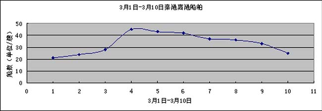 3月1日-3月10日這段時間內,秦港離港舶最多的一天為45艘,秦港離港舶最少的一天為21艘。其中3月4日離港船舶的數量最多為 45艘,3月1日離港船舶數量最少為 21艘; 3月2日、10日秦港離港船舶的數量在24艘左右;3月3日秦港離港船舶為28艘。3月5日、6日秦港離港船舶的數量在42艘左右;3月7日、8日秦港離港船舶的數量在36艘左右;3月9日秦港離港船舶的數量為33艘。秦港離港船舶的數量比上月下旬有所增加,秦港作業動態一切正常。