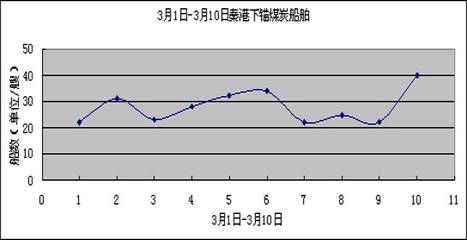 3月1日-3月10日這一周時間內,下錨煤炭船舶最多的一天為40艘,最少的一天為22 艘。其中3月10日下錨煤炭船舶最多為40艘; 3月1日下錨煤炭船舶最少為22艘;3月2日下錨煤炭船舶為31艘;3月3日、7日、9日下錨煤炭船舶在23艘左右;3月4日、8日下錨煤炭船舶在27艘左右;3月5日、6下錨煤炭船舶在33艘左右。秦港下錨船舶比上月下旬的數量有所增加,但數量仍然教少; 主要原因是本地煤炭價格仍然較高,南方電廠煤炭需求有所緩減,所以來港裝船煤炭船舶數量仍然較少.