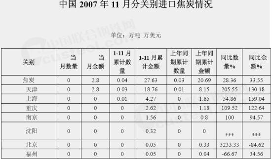2007年11月中國焦炭進口分關別統計情況