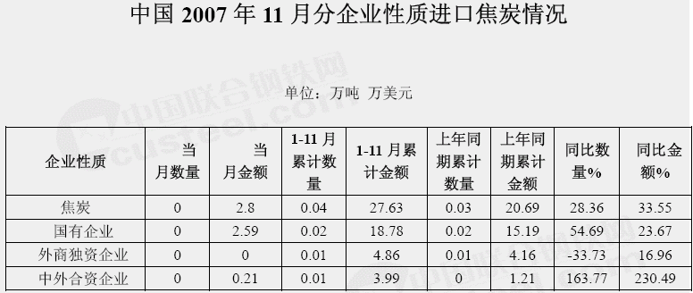 2007年11月份我國焦炭進口分企業性質數據統計情況