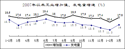 發電量增速減緩,效益明顯下降。全國發電量8051億千瓦時,增長14%,減緩1.5個百分點;其中,火電、水電分別增長13.4%和11.4%。由于受災電網全面恢復正常和災后恢復重建等多方面因素,電力需求呈快速增長之勢。3月份,廣東、廣西、云南、貴州4個省級電網出現拉限電,其中廣東電力供應持續偏緊。前兩個月,由于煤炭價格上漲和低溫雨雪冰凍災害造成嚴重損失,電力行業實現利潤95.4億元,下降55.9%,去年同期為增長59.2%。其中,電力生產業、電力供應業利潤分別下降70.6%和37.6%,去年同期為增長40.1%和89.8%。