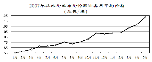 5月份,全國原油產量同比增長1.8%,增速比上月加快1.5個百分點;原油加工量下降1.1%,其中汽油產量下降6.4%,柴油產量增長2.6%。天然氣產量增長12%,減緩1.4個百分點。國際油價不斷攀高。WTI原油價格5月22日一度達到135.03美元/桶,為全月最高水平,再創歷史新高。當月布倫特原油平均價122美元/桶,比上月上漲13.2美元/桶,漲幅為12.2%;同比上漲54.2美元/桶,漲幅為80%。